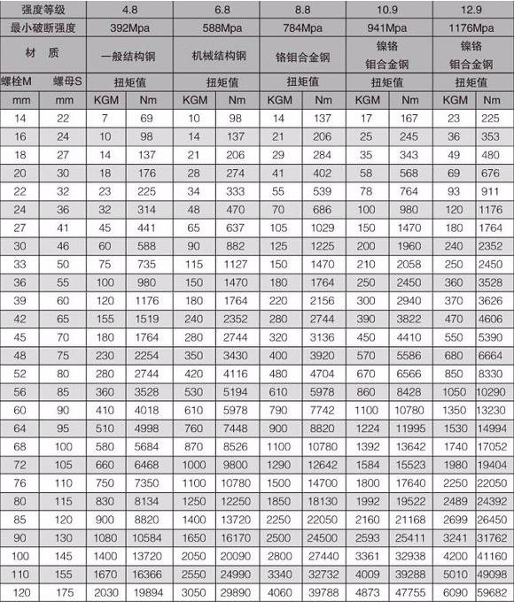 相信許多用戶在選購(gòu)液壓扭矩扳手之前都看過液壓扳手扭矩對(duì)照表,液壓扳手扭矩對(duì)照表其實(shí)就是螺栓扭矩值推薦表,它主要被用來查詢螺栓螺母的強(qiáng)度等級(jí)、材質(zhì)和螺栓大小扭矩值的一張表格,能夠更好的幫助用戶選擇合適的扳手型號(hào),下圖就是液壓扳手扭矩對(duì)照表。