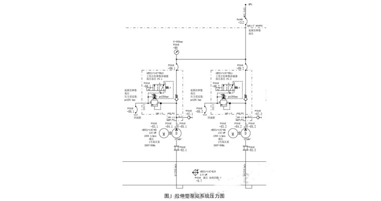 拉伸墊泵站由控制油泵、高壓油泵、低壓油泵、循環(huán)冷卻泵組成。實際工作中,除開其它原因?qū)е碌谋脝訔l件不滿足的情況外,系統(tǒng)壓力故障主要有兩種情況,液壓泵損壞和泵出口控制閥損壞。液壓泵或電機損壞直接導致系統(tǒng)無壓力,這種故障查找也非常簡單:啟動液壓泵檢查電機和泵的運行狀態(tài),如果運行正常,泵體和進出油管溫度與油箱溫度接近,說明泵沒有問題;如泵不能啟動,即可排查電機控制電路的熔斷器,如熔斷器正常,即可檢查電機繞組;若出現(xiàn)液壓泵能夠啟動但超負載的現(xiàn)象,需要拆分電機和泵的連接,分別盤車,排查故障是電機還是泵的原因造成。液壓拉伸墊泵站采用先導式溢流閥、換向閥和單向閥的組合,實現(xiàn)系統(tǒng)供油和泵無壓循環(huán)功能,如圖 1 所示:拉伸墊動作時系統(tǒng)壓力開關(guān)監(jiān)控到壓力降低至最小工作壓力,就會給出指令到控制溢流閥的換向閥;換向閥得電斷開先導閥回油,溢流閥停止無壓循環(huán)開始往系統(tǒng)供油;當系統(tǒng)壓力達到最大工作壓力后換向閥失電,系統(tǒng)開啟無壓循環(huán),單向閥阻止系統(tǒng)油液回流。由于從供油至無壓循環(huán)交替的過程中,單向閥也會隨開啟關(guān)閉動作,插裝式單向閥關(guān)閉時如果進出口壓差過大,閥芯關(guān)閉就會沖擊閥體,可能導致閥體碎裂,泵出口油路與回油管直通。若拉伸墊設(shè)備在投入使用初期,可能會多次出現(xiàn)單向閥損壞使得系統(tǒng)壓力不能建立故障,這就需要調(diào)低先導式溢流閥的開啟壓力即可解決這個問題。而溢流閥的壓力調(diào)整可以根據(jù)壓力切換時的狀態(tài)來調(diào)整,可先將壓力調(diào)高至單向閥關(guān)閉時到出現(xiàn)嚴重撞擊閥體上限,再略微調(diào)低壓力,直到單向閥柔和關(guān)閉為止。溢流閥壓力調(diào)整太低則會導致系統(tǒng)達不到最高壓力而一直供油,油液一直溢流回油箱的現(xiàn)象。