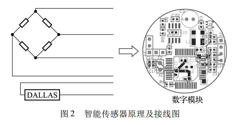 將模擬應(yīng)變式傳感器經(jīng)過(guò)組橋后直接將電橋的電壓模擬信號(hào)接入單片機(jī) CS5530 的模擬輸入端,通過(guò) CS5530的A/D 轉(zhuǎn)換器將電壓信號(hào)轉(zhuǎn)換成數(shù)字信號(hào), 單片機(jī)對(duì)時(shí)鐘電路、復(fù)位電路、電源電路、串行通訊模塊、存儲(chǔ)模塊進(jìn)行控制,通過(guò)編程處理后按照一定的格式將數(shù)據(jù)通過(guò) RS485 串行通訊接口輸出。采用DALLAS2401半導(dǎo)體芯片。該芯片在工廠生產(chǎn)時(shí),刻入經(jīng)檢測(cè)的64位注冊(cè)碼(8位家族碼+48位序列碼+8位CRC校驗(yàn)碼),因此可以保證沒(méi)有任何兩個(gè)器件的注冊(cè)碼是相同的。采用低成本 TSOC 表面貼封裝,方便裝在傳感器插頭或接線腔中。原理圖如圖2所示。