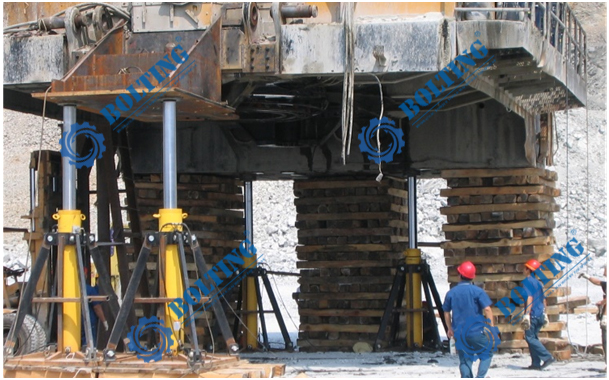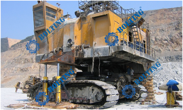 已知所需頂升設備為礦用電鏟,對電鏟進行回轉支承維護等工作,總重量約為1000噸,需更換履帶行走裝置、回轉裝置等部件,就需要將整機同步頂升,平穩(wěn)的頂起到一定的高度,便于現(xiàn)場的檢修,頂升過程中需保證不損壞整機結構,也需使其均衡受力。