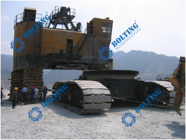電鏟是千萬噸級露天礦山主要采掘設備之一,生產率高,作業(yè)率高,操作成本低,是目前采礦業(yè)公認的機型。電鏟由行走裝置、回轉裝置、工作裝置、潤滑系統(tǒng)、供氣系統(tǒng)組成。鏟斗是電鏟的主要部件,它直接承受被挖掘礦石的作用力,因而磨損較大,斗桿也是電鏟挖掘過程中的主要部件之一,它的作用是連接和支持鏟斗,并將推壓作用傳送給鏟斗,鏟斗在推壓和提升力的共同作用下完成挖掘土壤的動作;其行走機構中最為核心的履帶裝置,經(jīng)過相關的傳動機構最終使其在地面直接移動!