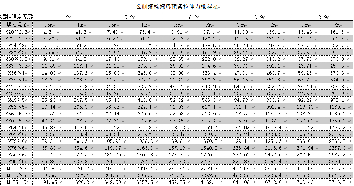 公制螺栓螺母預(yù)緊拉伸力推薦表